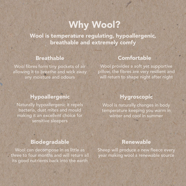 Easy Care – Keep your pillow fresh by airing it in sunlight at least four times a year. This naturally sanitises the wool and cotton, removes moisture, and revitalises the fibres to maintain their loft and longevity.